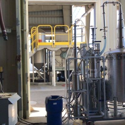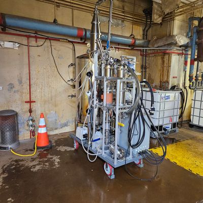 This upgraded version of VaSA system mainly composed of a vacuum stripper and a gas absorption column, which were connected through a demister and driven by a vacuum pump. All the vessels and fittings were stainless-steel triclamp sanitary products. The vacuum stripper was custom fabricated by a US Equipment Manufacturer. It had two flat-bottom tanks mounted vertically inside a 473-L vessel. Each tank had outer diameter of 743 mm and the bottom head with inner diameter of 762 mm of the large vacuum vessel with screw plug immersion heaters and thermocouple for temperature regulation and power control. The demister was built with concentric reducers and spools having diameters from 203 mm to 38 mm in a total length of 1.1 m and loosely packed with stainless-steel scrubbing pads. The demister was designed to separate water vapor from NH3 gas by surface air cooling and reflux water droplets and condensate, targeting a temperature drop from the stripper’s head to the demister top since ammonia solubility in water is nearly zero at temperatures 9 ◦C below the vacuum boiling point. Water reflux relies on gravity settling of water droplets against upward vapor flow. Demister height determines vapor residence time for condensation. Water reflux rate, hence, varies with its diameter and height. The demister was installed with gasket screens and stainless-steel scrubbers to improve water reflux and minimize water vapor flux. The demister was assembled with concentric reducers to match the gradual decrease in vapor flux and temperature. The gas absorption column was built on a cylindrical sanitary spool with ball valves and secondary chambers to add sulfuric acid and discharge absorption solutions. A water/air-cooled water trap was installed before the vacuum pump to further capture the escaped water vapor by condensation.